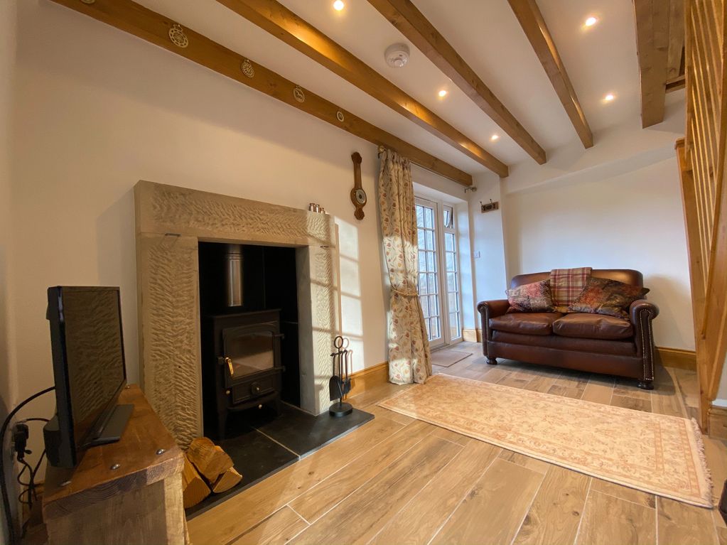 The ground floor living room has access from the outside via two double opening patio doors onto an attractive wood effect, porcelain tiled floor that is also very hygienic. The room is decorated in neutral colours with woodland themed accents and rustic ceiling beams.